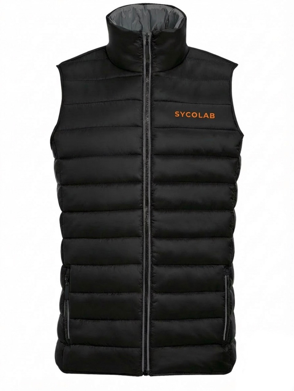 The Sycolab Body Warmer is a unisex jacket and is available in siler/Grey with black front left breast Sycolab logo or in blsck with a orange Sycolab logo, warm and stylish and a firm favourite of one of our founders.